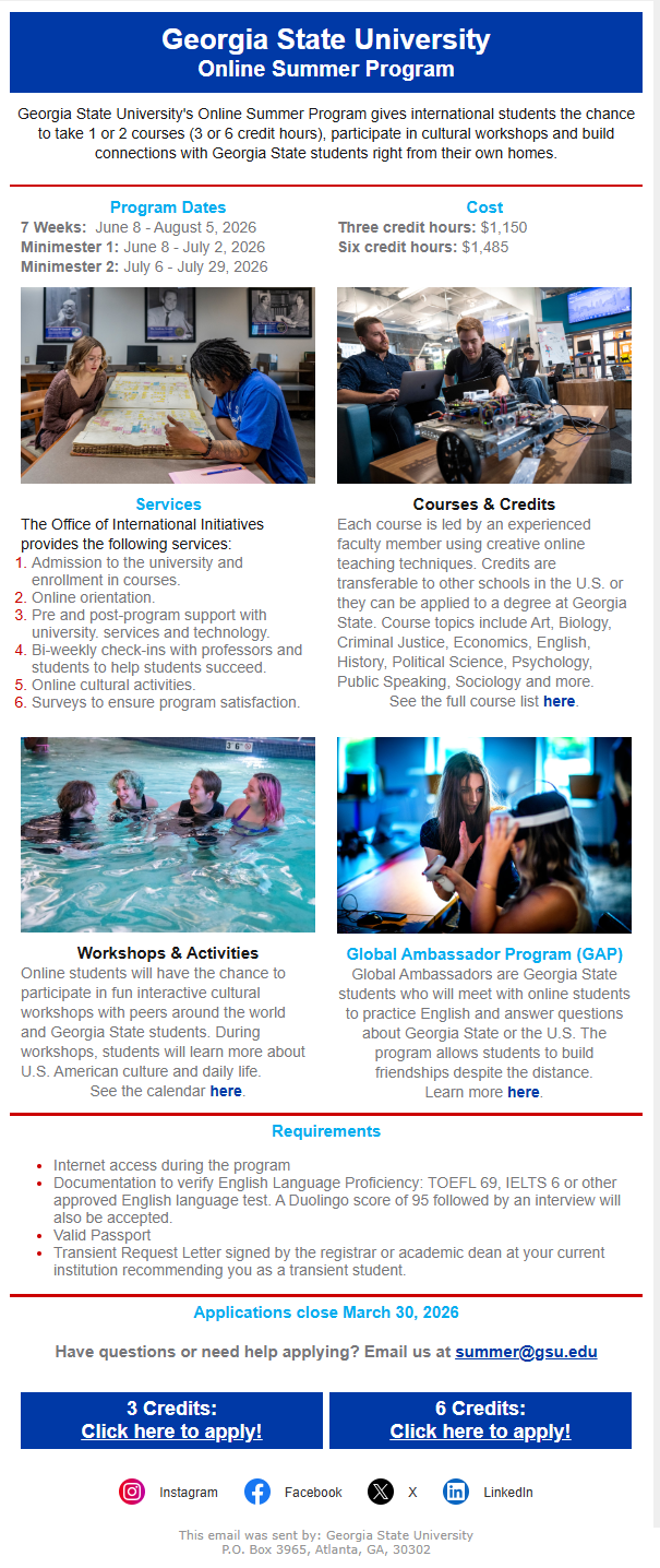 时间:7周项目:2026年6月8日至8月5日 Mini-mester1:2026年6月8日至7月2日 Mini-mester2:2026年7月6日至7月29日 选派类别:本科生 开设课程:历史、生物、心理学、社会学、政治学等相关领域课程课程 语言要求:TOEFL 69,IELTS 6,或其他能够证明语言能力的英语成绩。多邻国95以上且通过面试亦可被接受。 项目费:3学分1,150美元;6学分1,485美元(含课程费、线上文化互动工作坊和文化活动费) 报名方式:完成校内报名的同时自行完成对方高校的报名(外方申请截止:3月30日) 详细介绍:/GeorgiaStateSummer.png |